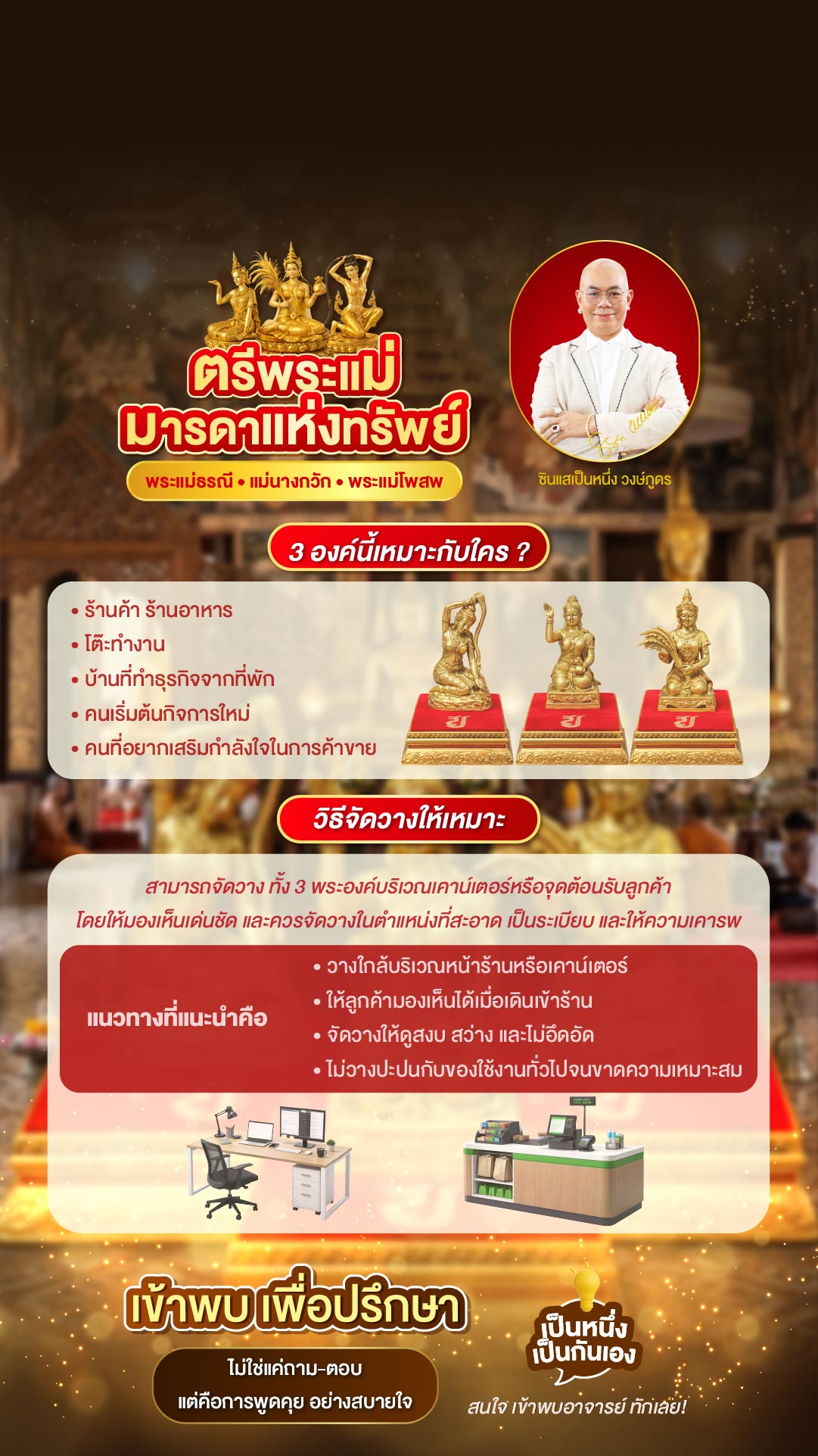 สามารถจัดวาง ทั้ง 3 พระองค์บริเวณเคาน์เตอร์หรือจุดต้อนรับลูกค้า โดยให้มองเห็นเด่นชัด