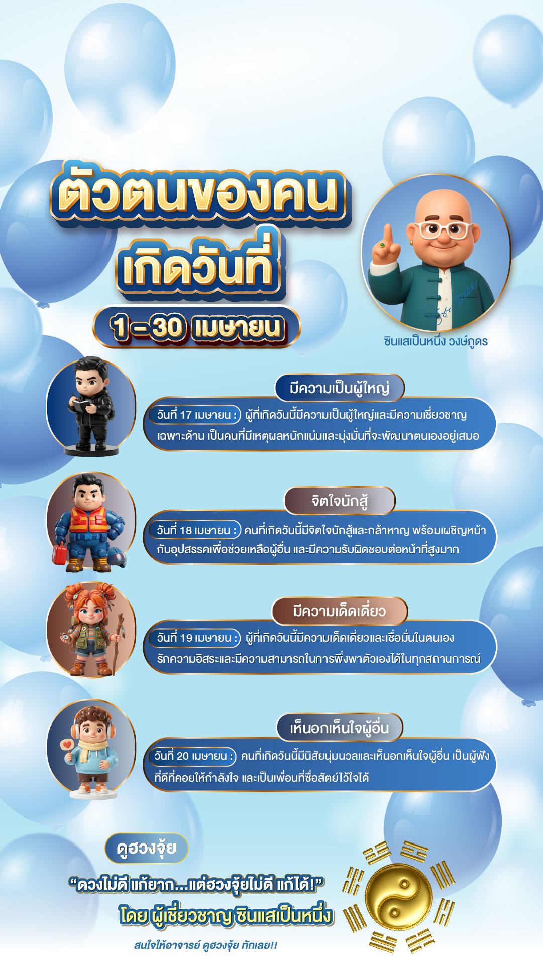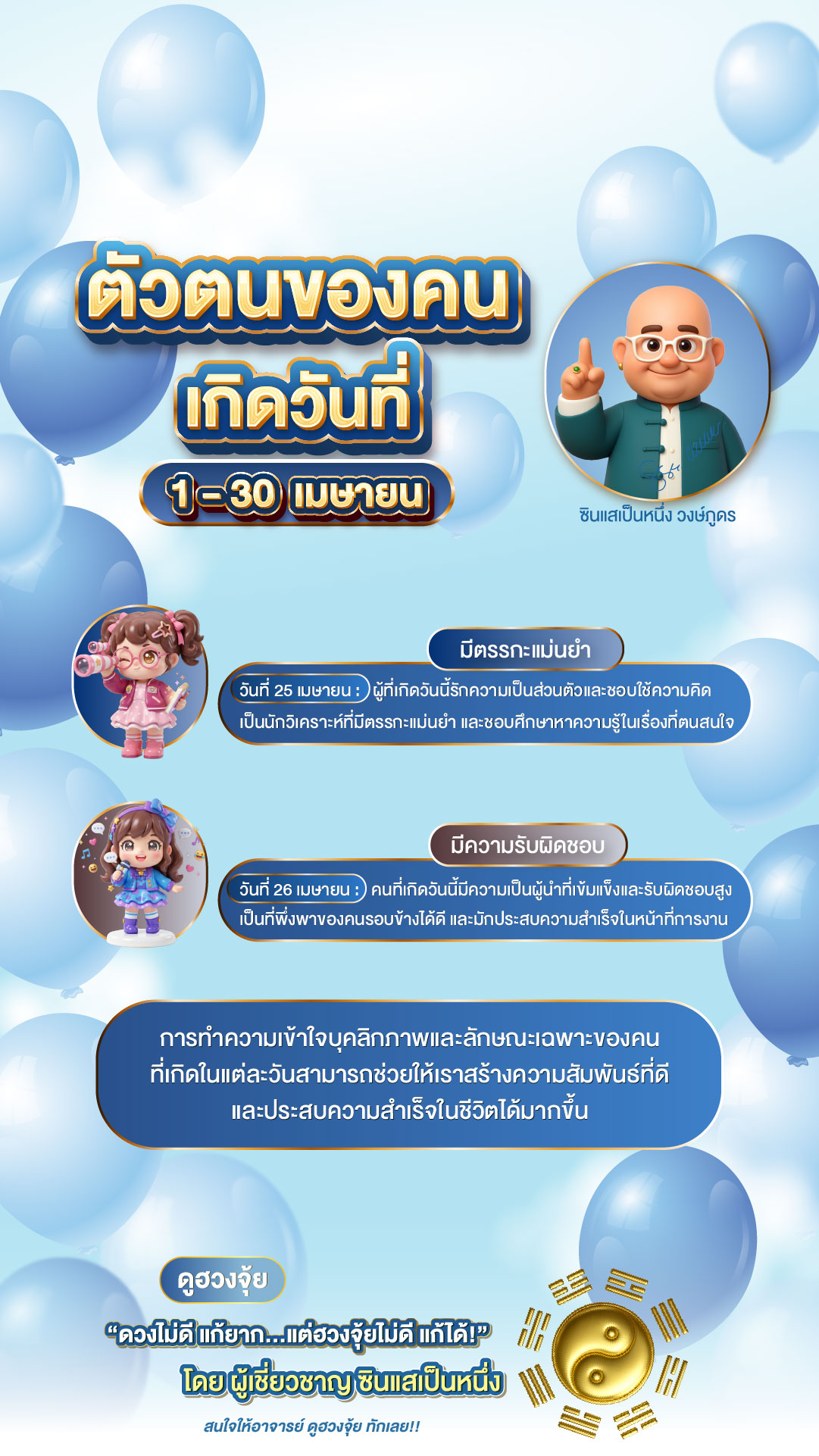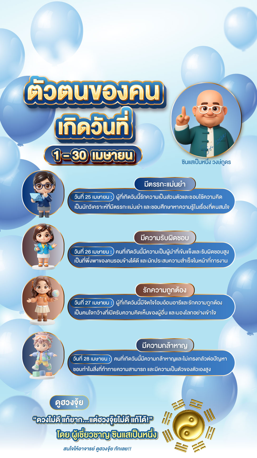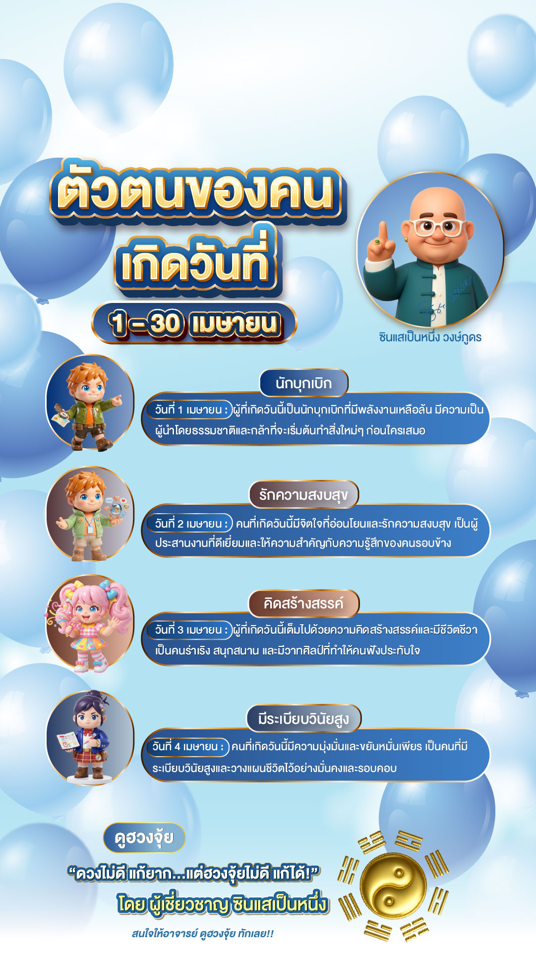 นี่คือคำทำนายนิสัยสำหรับคนที่เกิดเดือน เมษายน (วันที่ 1 – 30) ครับ ปรับภาษาให้กระชับ อ่านง่าย และเน้นจุดเด่นที่เป็นพลังบวกครับ