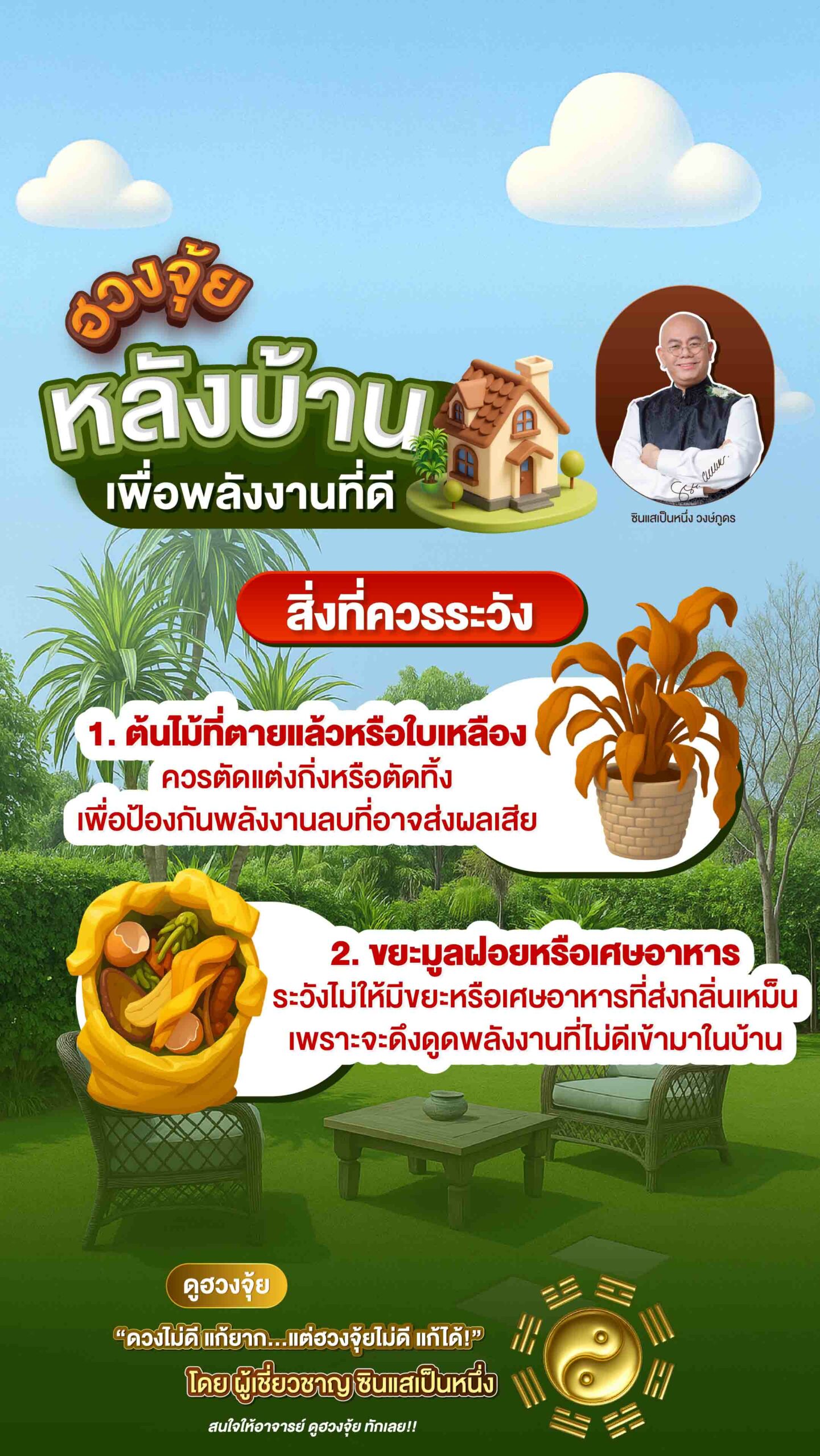 o   หลังบ้านควรสะอาด ปราศจากสิ่งของรกและขยะ เพราะสิ่งเหล่านี้จะกีดขวางการไหลเวียนของพลังงานที่ดี