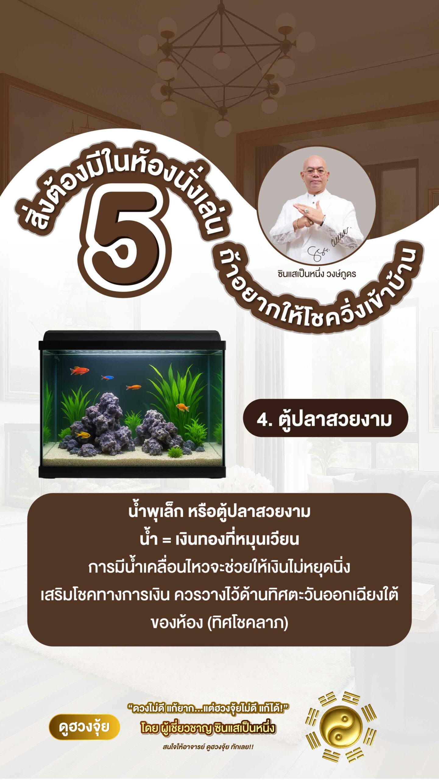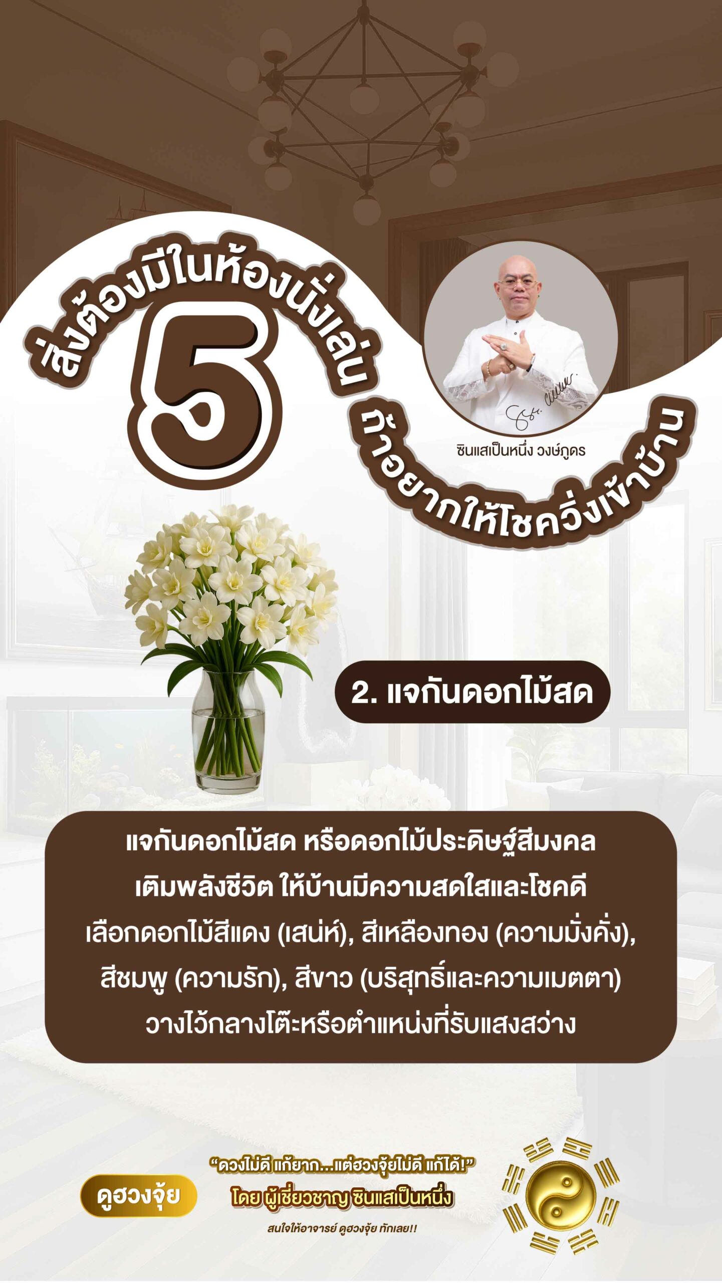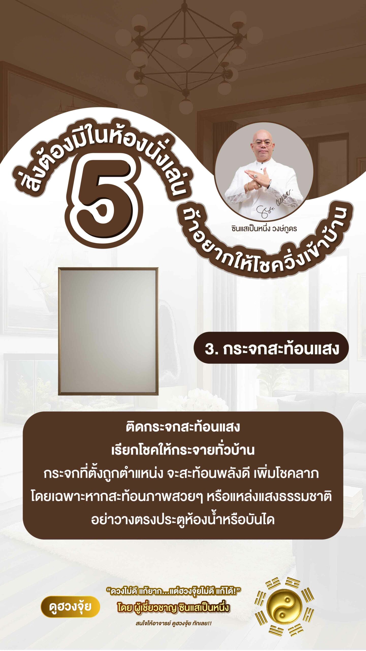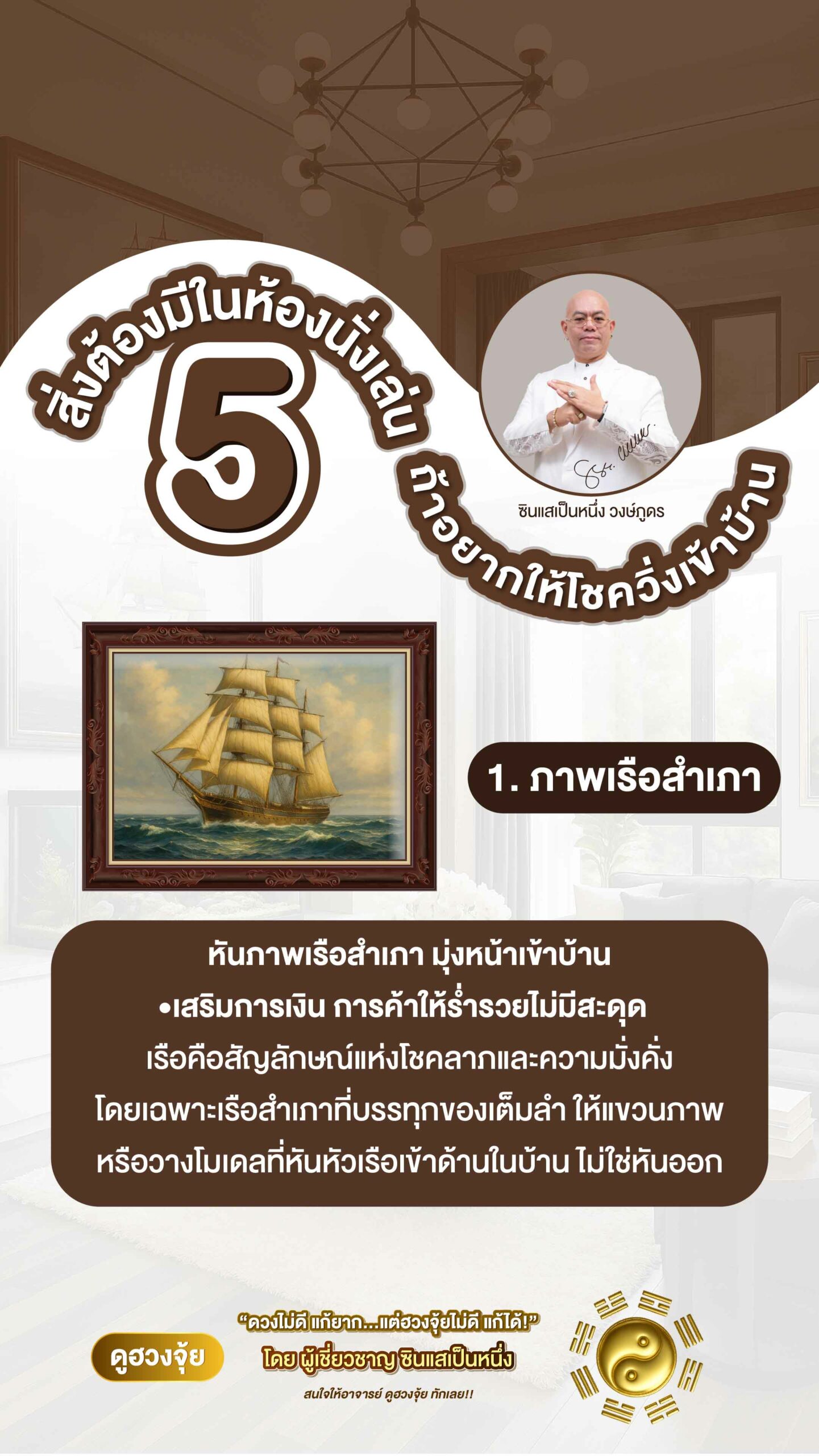 5 สิ่งต้องมีในห้องนั่งเล่น ถ้าอยากให้โชควิ่งเข้าบ้าน ภาพเรือสำเภา มุ่งหน้าเข้าบ้าน – เสริมการเงิน การค้าให้ร่ำรวยไม่มีสะดุด เรือคือสัญลักษณ์แห่งโชคลาภและความมั่งคั่ง โดยเฉพาะเรือสำเภาที่บรรทุกของเต็มลำ ให้แขวนภาพหรือวางโมเดลที่หันหัวเรือเข้าด้านในบ้าน ไม่ใช่หันออก แจกันดอกไม้สด หรือดอกไม้ประดิษฐ์สีมงคล เติมพลังชีวิต ให้บ้านมีความสดใสและโชคดี เลือกดอกไม้สีแดง (เสน่ห์), สีเหลืองทอง (ความมั่งคั่ง), สีชมพู (ความรัก), สีขาว (บริสุทธิ์และความเมตตา) วางไว้กลางโต๊ะหรือตำแหน่งที่รับแสงสว่าง กระจกสะท้อนแสง เรียกโชคให้กระจายทั่วบ้าน กระจกที่ตั้งถูกตำแหน่ง จะสะท้อนพลังดี เพิ่มโชคลาภ โดยเฉพาะหากสะท้อนภาพสวยๆ หรือแหล่งแสงธรรมชาติ อย่าวางตรงประตูห้องน้ำหรือบันได น้ำพุเล็ก หรือตู้ปลาสวยงาม น้ำ = เงินทองที่หมุนเวียน การมีน้ำเคลื่อนไหวจะช่วยให้เงินไม่หยุดนิ่ง เสริมโชคทางการเงิน ควรวางไว้ด้านทิศตะวันออกเฉียงใต้ของห้อง (ทิศโชคลาภ) หินมงคล หรือวัตถุมงคลประจำบ้าน ปรับพลังงานบ้านให้นิ่ง และดึงดูดพลังดี เช่น หยก, ปี่เซี่ยะ, เหรียญจีน, หรือรูปปั้นท้าวเวสสุวรรณ พระสังกัจจายน์ แม่นางกวัก ฯลฯ ควรจัดวางในตำแหน่งที่สูงกว่าระดับสายตาเล็กน้อย ภาพเรือสำเภา มุ่งหน้าเข้าบ้าน แจกันดอกไม้สด หรือดอกไม้ประดิษฐ์สีมงคล กระจกสะท้อนแสง น้ำพุเล็ก หรือตู้ปลาสวยงาม หินมงคล หรือวัตถุมงคลประจำบ้าน PrevNext