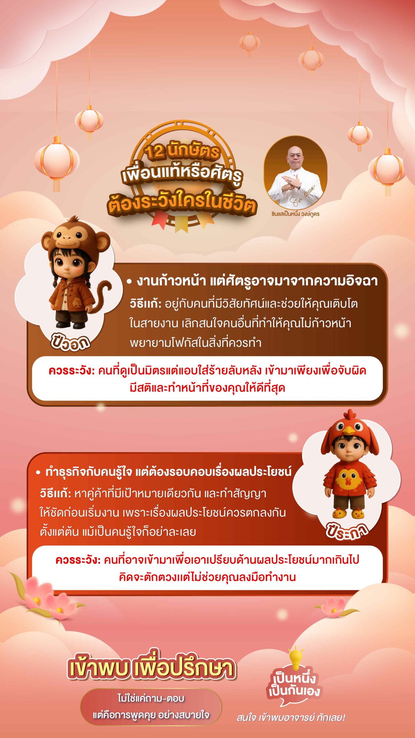 •  ปีระกา – ทำธุรกิจกับคนรู้ใจ แต่ต้องรอบคอบเรื่องผลประโยชน์