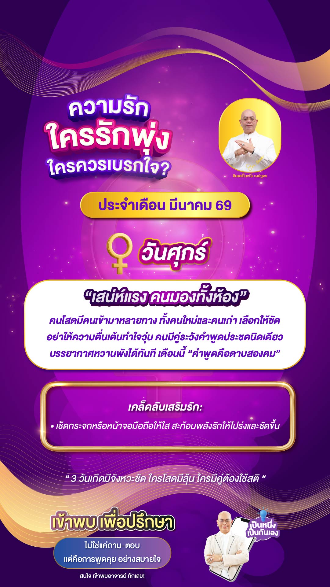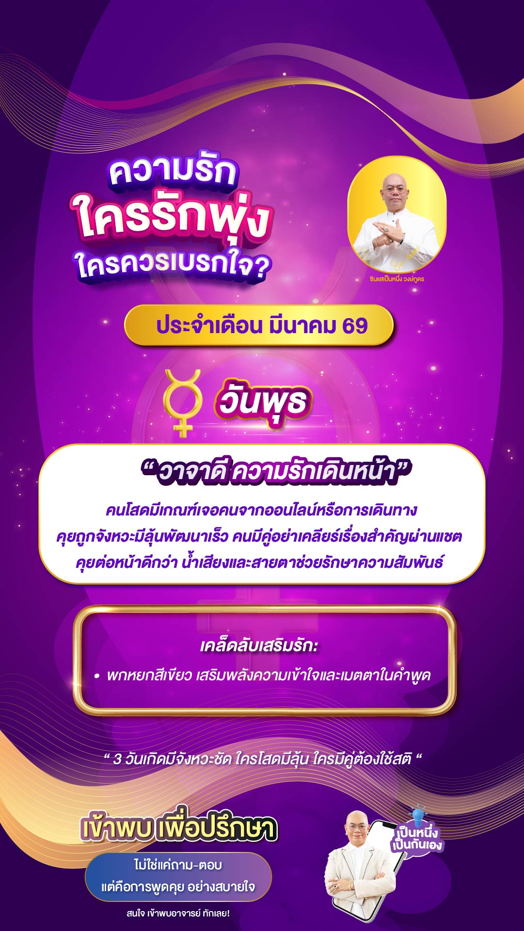 💖 วันศุกร์ – เสน่ห์แรง คนมองทั้งห้อง คนโสดมีคนเข้ามาหลายทาง ทั้งคนใหม่และคนเก่า เลือกให้ชัด อย่าให้ความตื่นเต้นทำใจวุ่น คนมีคู่ระวังคำพูดประชดนิดเดียว บรรยากาศหวานพังได้ทันที เดือนนี้ “คำพูดคือดาบสองคม” 💡 เคล็ดลับ เช็ดกระจกหรือหน้าจอมือถือให้ใส สะท้อนพลังรักให้โปร่งและชัดขึ้น 🌿 วันพุธ – วาจาดี ความรักเดินหน้า คนโสดมีเกณฑ์เจอคนจากออนไลน์หรือการเดินทาง คุยถูกจังหวะมีลุ้นพัฒนาเร็ว คนมีคู่อย่าเคลียร์เรื่องสำคัญผ่านแชต คุยต่อหน้าดีกว่า น้ำเสียงและสายตาช่วยรักษาความสัมพันธ์ 💡 เคล็ดลับ พกหยกสีเขียว เสริมพลังความเข้าใจและเมตตาในคำพูด 🌙 วันจันทร์ – รักค่อย ๆ ฟูใจ คนโสดเสน่ห์อบอุ่นแบบไม่ต้องพยายาม แค่ยิ้มและกล้าทักก่อนหนึ่งครั้ง ใจจะเปิดเอง คนมีคู่ห้ามเงียบใส่กัน ใช้น้ำเสียงดี ๆ แล้วเรื่องเล็กจะไม่ลุกลาม 💡 เคล็ดลับ รอยยิ้มหนึ่งที คือการเปิดประตูหัวใจใหม่ PrevNext