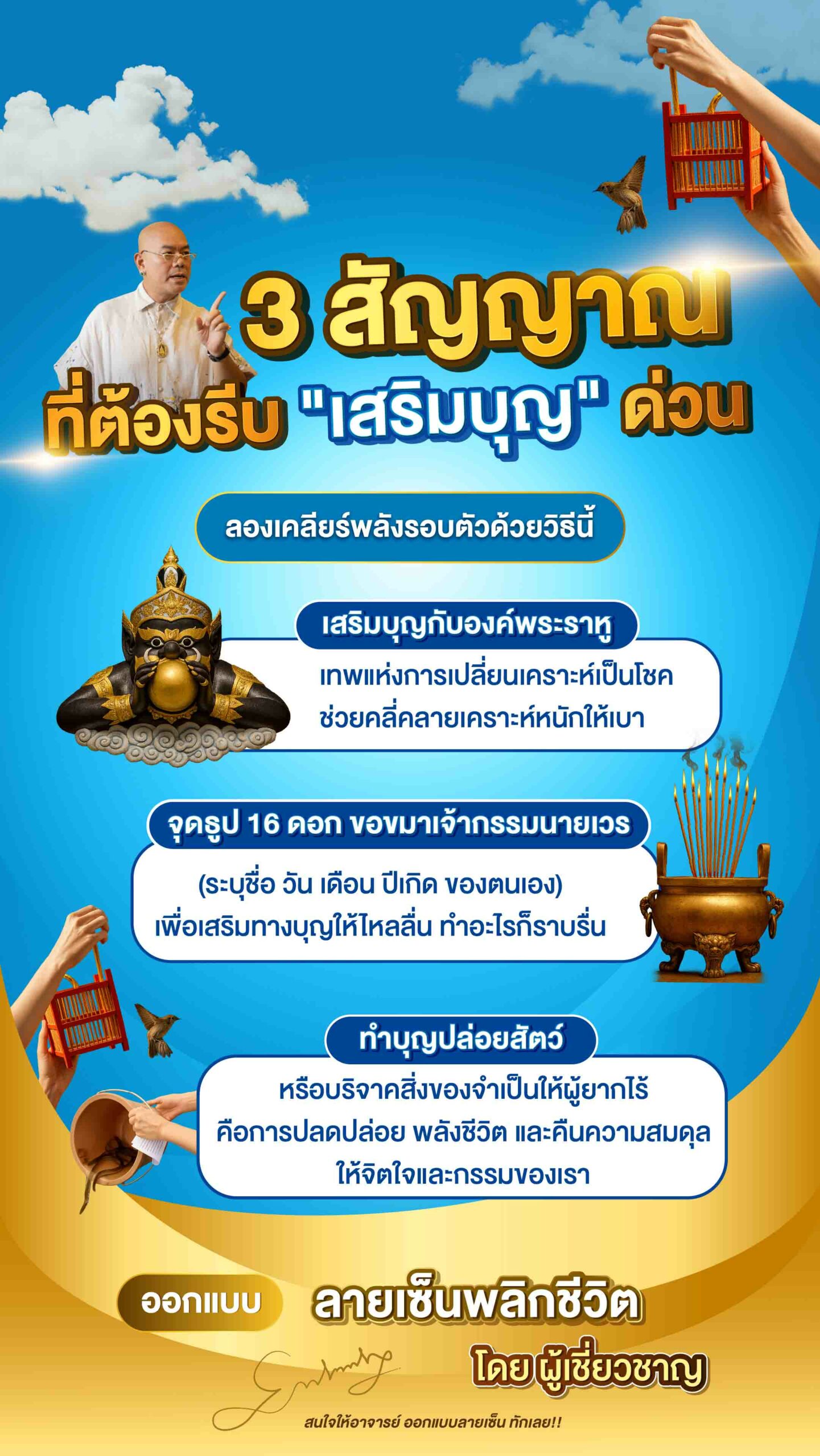 - ทำบุญปล่อยสัตว์ หรือบริจาคสิ่งของจำเป็นให้ผู้ยากไร้ คือการปลดปล่อย พลังชีวิต และคืนความสมดุลให้จิตใจและกรรมของเรา