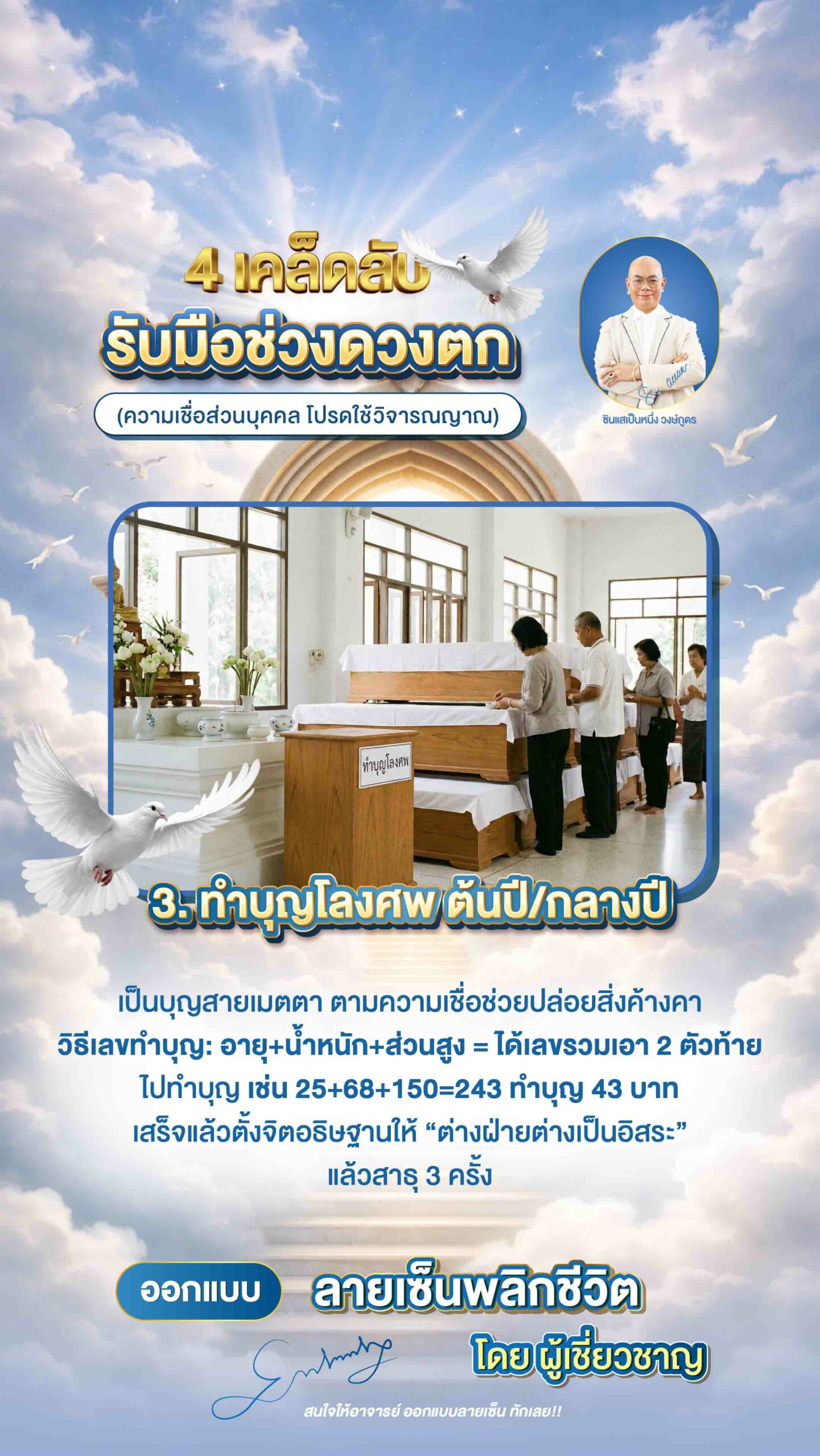 วิธีเลขทำบุญ: อายุ+น้ำหนัก+ส่วนสูง = ได้เลขรวม → เอา 2 ตัวท้าย ทำบุญ