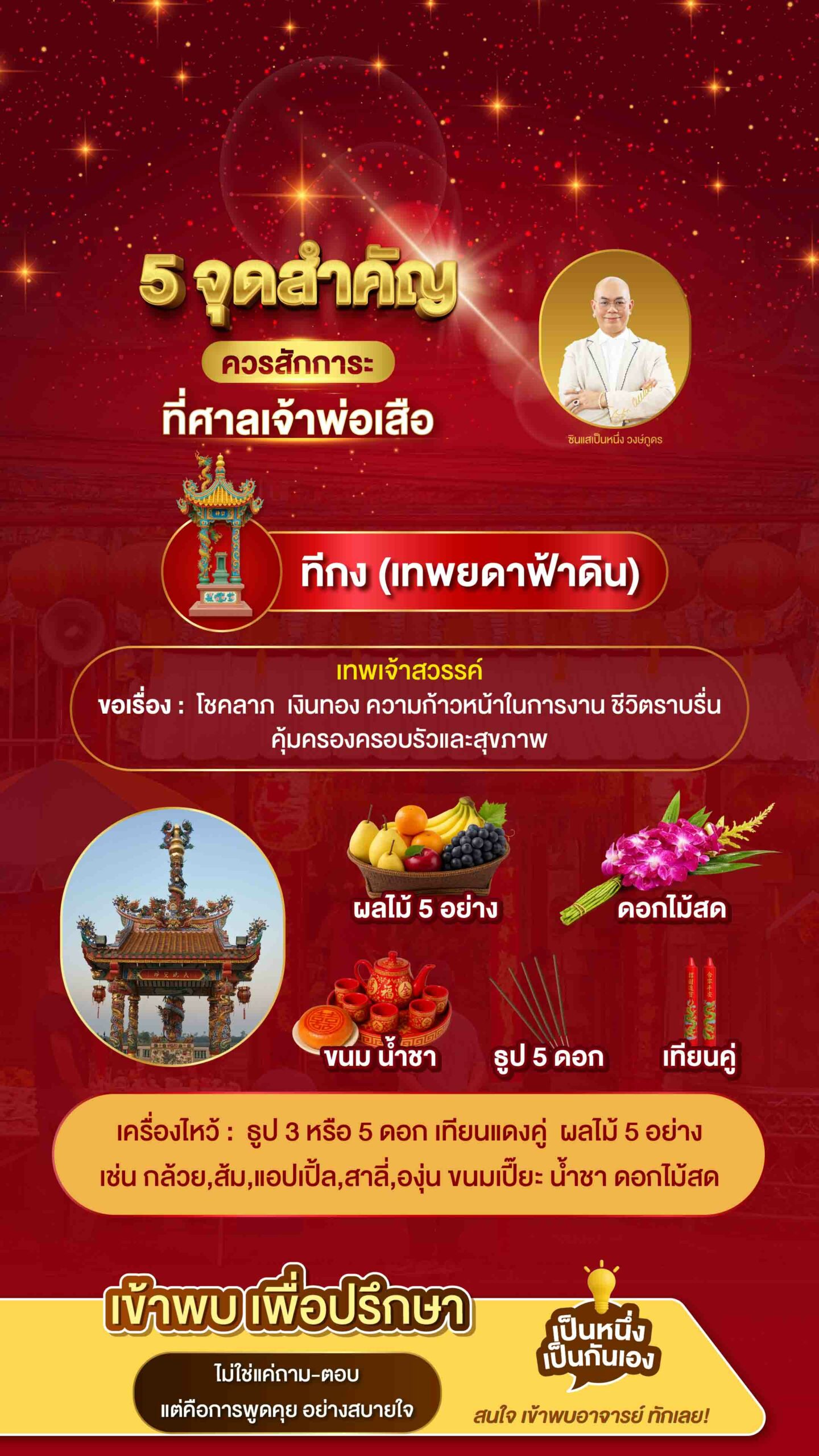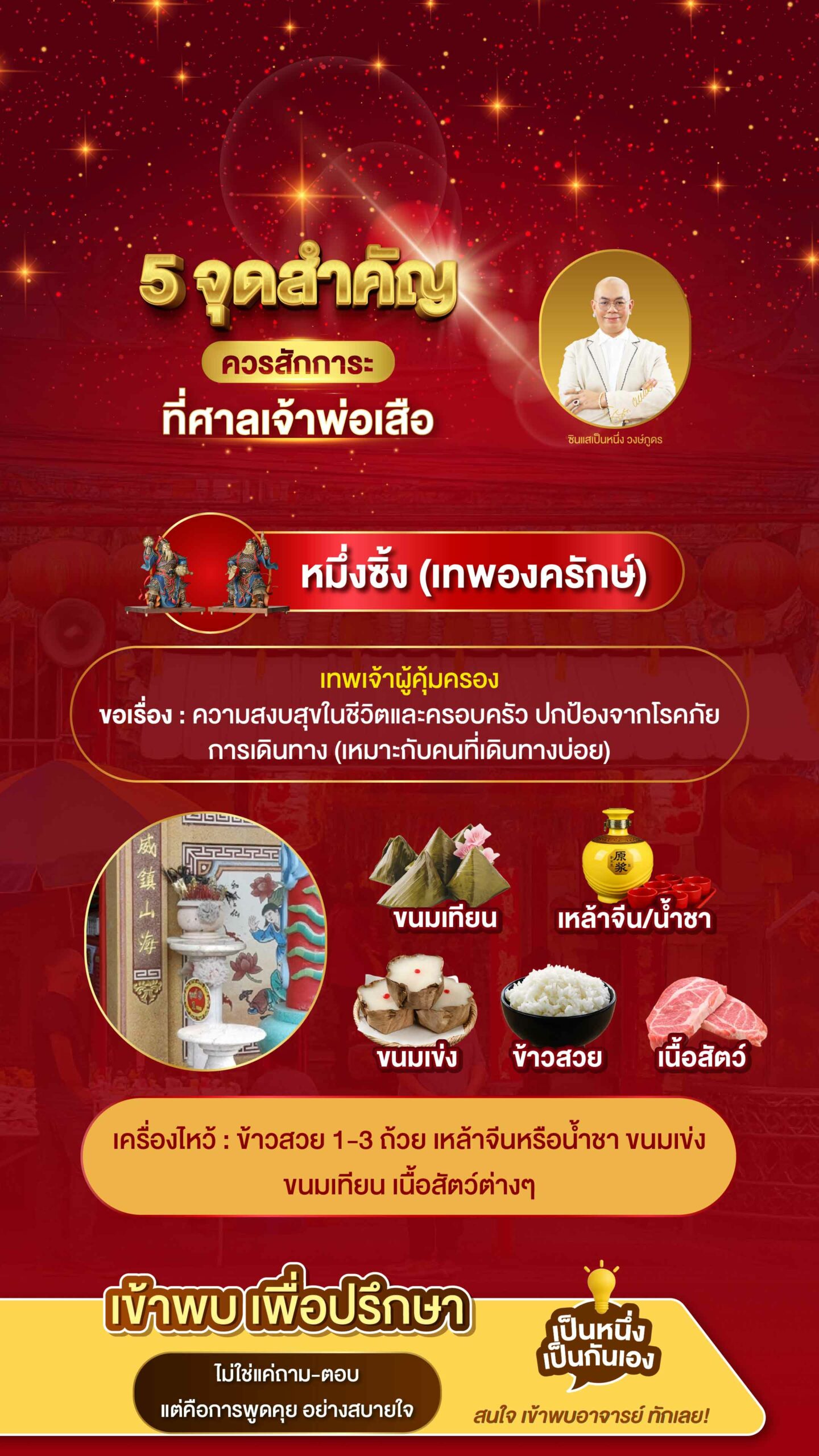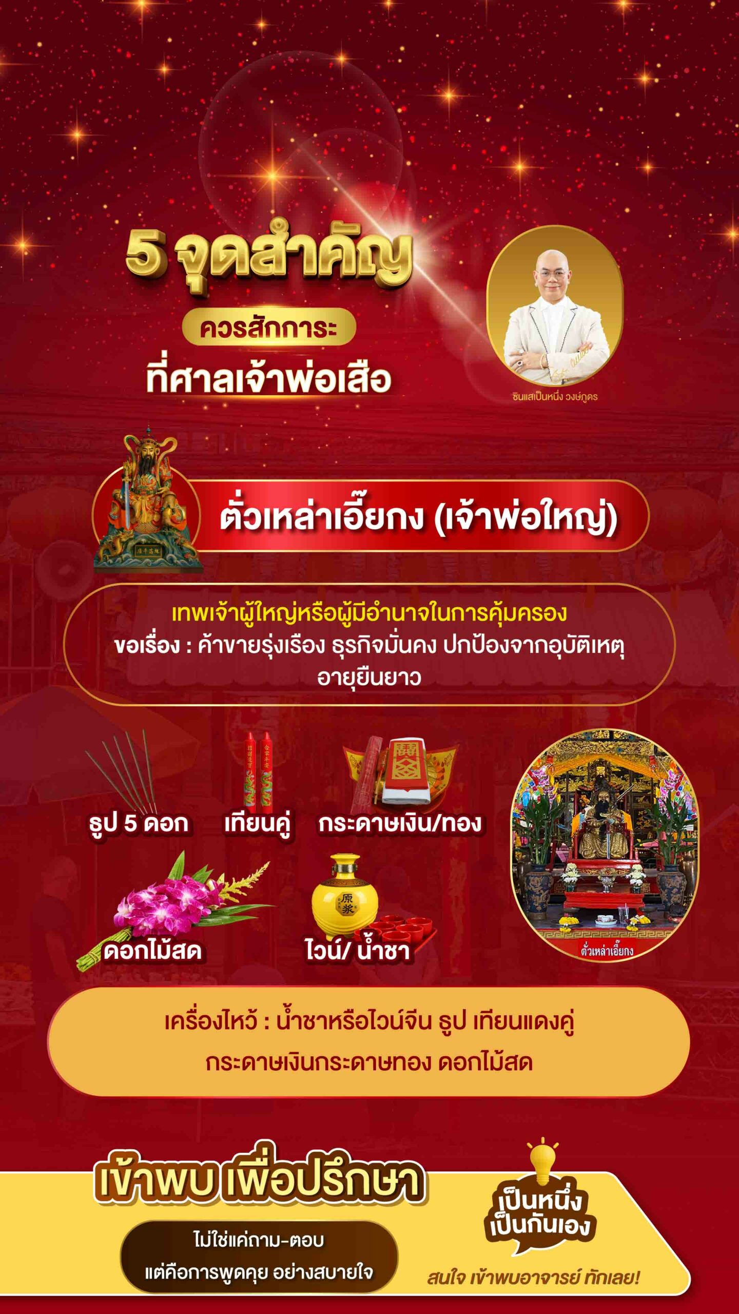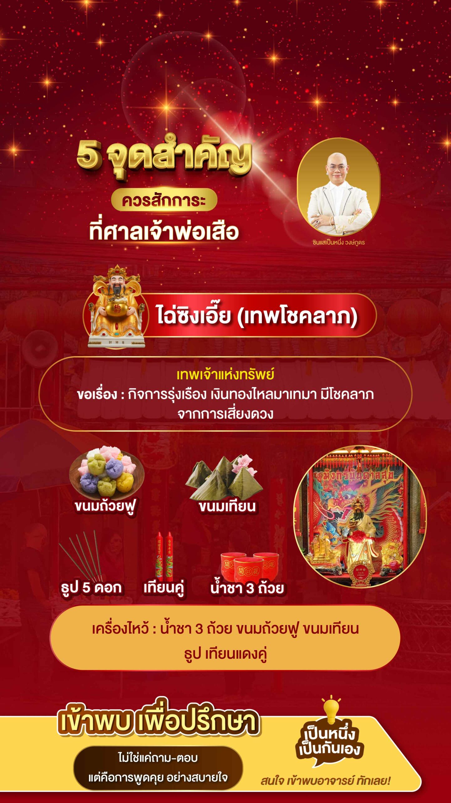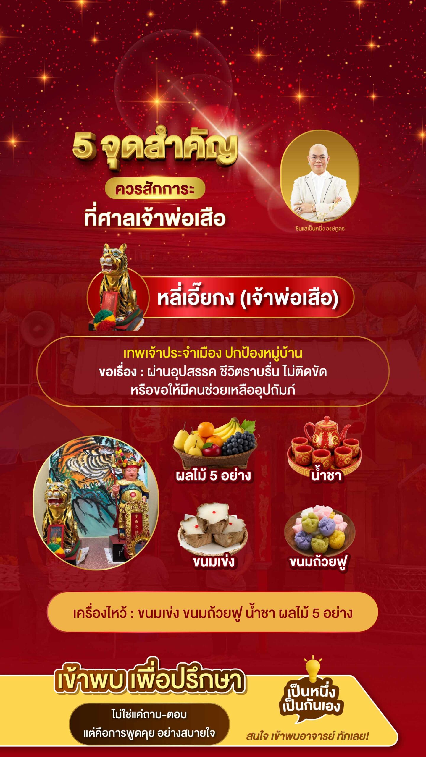 “ถ้าอยากปังทั้งงาน เงิน โชค สุขภาพ ต้องไป!! เพราะนี่คือ ‘5 จุดสำคัญ ที่ศาลเจ้าพ่อเสือ’ ที่สายมูต้องไหว้ให้ครบ!” 1.ทีกง (เทพยดาฟ้าดิน) เทพเจ้าสวรรค์ ขอเรื่อง: โชคลาภ เงินทอง ความก้าวหน้าในการงาน ชีวิตราบรื่น คุ้มครองครอบรัวและสุขภาพ เครื่องไหว้: ธูป3หรือ5ดอก เทียนแดงคู่ ผลไม้5อย่าง เช่น กล้วย,ส้ม,แอปเปิ้ล,สาลี่,องุ่น ขนมเปี๊ยะ น้ำชา ดอกไม้สด 2.ตั่วเหล่าเอี๊ยกง (เจ้าพ่อใหญ่) เทพเจ้าผู้ใหญ่หรือผู้มีอำนาจในการคุ้มครอง ขอเรื่อง: ค้าขายรุ่งเรือง ธุรกิจมั่นคง ปกป้องจากอุบัติเหตุ อายุยืนยาว เครื่องไหว้: น้ำชาหรือไวน์จีน ธูป เทียนแดงคู่ กระดาษเงินกระดาษทอง ดอกไม้สด 3.หลี่เอี๊ยกง (เจ้าพ่อเสือ) เทพเจ้าประจำเมือง ปกป้องหมู่บ้าน ขอเรื่อง: ผ่านอุปสรรค ชีวิตราบรื่น ไม่ติดขัดหรือขอให้มีคนช่วยเหลืออุปถัมภ์ เครื่องไหว้: ขนมเข่ง ขนมถ้วยฟู น้ำชา ผลไม้5อย่าง 4.ไฉ่ซิงเอี๊ย (เทพโชคลาภ) เทพเจ้าแห่งทรัพย์ ขอเรื่อง: กิจการรุ่งเรือง เงินทองไหลมาเทมา มีโชคลาภจากการเสี่ยงดวง เครื่องไหว้: น้ำชา3ถ้วย ขนมถ้วยฟู ขนมเทียน ธูป เทียนแดงคู่ 5.หมึ่งซิ้ง (เทพองครักษ์) เทพเจ้าผู้คุ้มครอง ขอเรื่อง: ความสงบสุขในชีวิตและครอบครัว ปกป้องจากโรคภัย การเดินทาง (เหมาะกับคนที่เดินทางบ่อย) เครื่องไหว้: ข้าวสวย1-3ถ้วย เหล้าจีนหรือน้ำชา ขนมเข่ง ขนมเทียน เนื้อสัตว์ต่างๆ PrevNext