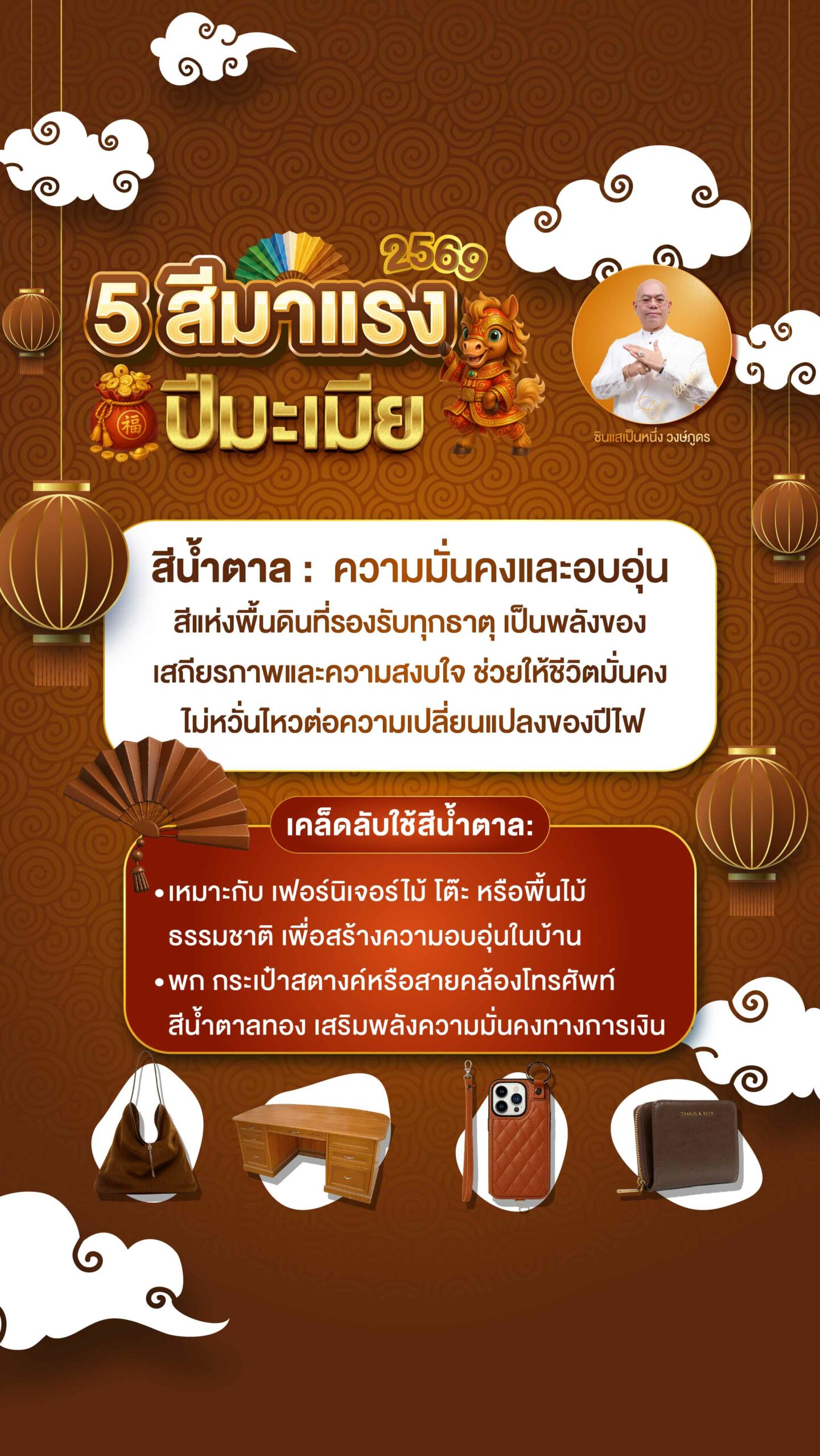 - พก กระเป๋าสตางค์หรือสายคล้องโทรศัพท์สีน้ำตาลทอง เสริมพลังความมั่นคงทางการเงิน