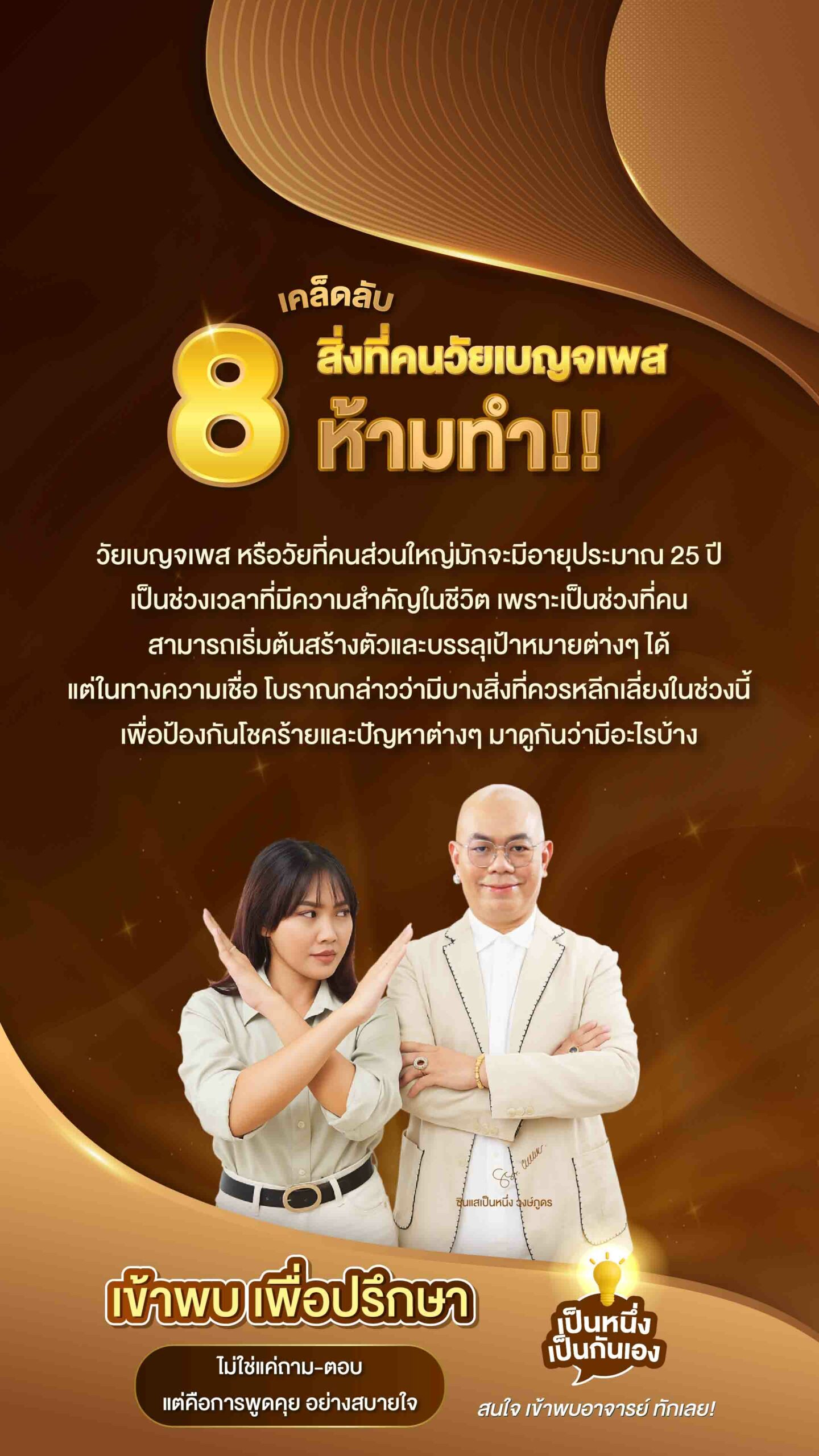 วัยเบญจเพศ หรือวัยที่คนส่วนใหญ่มักจะมีอายุประมาณ 25 ปี เป็นช่วงเวลาที่มีความสำคัญในชีวิต เพราะเป็นช่วงที่คนสามารถเริ่มต้นสร้างตัวและบรรลุเป้าหมายต่างๆ ได้ แต่ในทางความเชื่อ โบราณกล่าวว่ามีบางสิ่งที่ควรหลีกเลี่ยงในช่วงนี้ เพื่อป้องกันโชคร้ายและปัญหาต่างๆ มาดูกันว่ามีอะไรบ้าง หลีกเลี่ยงการตัดสินใจเปลี่ยนแปลงครั้งใหญ่ การเปลี่ยนงาน ย้ายบ้าน หรือเปลี่ยนแปลงชีวิตครั้งใหญ่ ควรมีการพิจารณาอย่างรอบคอบในช่วงนี้ เพราะอาจมีผลกระทบที่ไม่ได้คาดคิด ไม่ควรเดินทางไกลบ่อยๆ การเดินทางไกลในช่วงวัยเบญจเพศอาจทำให้มีโอกาสพบเจอเหตุการณ์ที่ไม่คาดคิด ดังนั้นควรหลีกเลี่ยงการเดินทางที่ไม่จำเป็น หลีกเลี่ยงการลงทุนที่มีความเสี่ยงสูง ในช่วงวัยนี้ ควรระมัดระวังการลงทุนที่มีความเสี่ยงสูง หลีกเลี่ยงการลงทุนที่ไม่แน่นอน เพื่อป้องกันการสูญเสียทรัพย์สิน ห้ามทะเลาะวิวาทหรือมีปากเสียง ควรหลีกเลี่ยงการมีปากเสียงหรือทะเลาะวิวาท เพราะอาจทำให้เกิดปัญหาที่ไม่สามารถแก้ไขได้ง่าย หลีกเลี่ยงการใช้อารมณ์ในการตัดสินใจ การตัดสินใจที่ใช้อารมณ์มักจะไม่เกิดผลดี ควรมีความใจเย็นและคิดให้รอบคอบก่อนลงมือทำ ไม่ควรยืมเงินหรือให้คนอื่นยืมเงิน การยืมเงินหรือให้ยืมเงินในช่วงนี้อาจนำมาซึ่งปัญหาทางการเงินและความสัมพันธ์ที่ยุ่งยาก หลีกเลี่ยงการทำสัญญาหรือข้อตกลงที่ผูกพันระยะยาว ควรหลีกเลี่ยงการทำสัญญาหรือข้อตกลงที่อาจผูกพันในระยะยาว เพราะอาจพบเจอปัญหาหรือข้อพิพาทในภายหลัง ห้ามประมาทในเรื่องสุขภาพ สุขภาพเป็นเรื่องสำคัญที่สุด ไม่ควรละเลยการดูแลสุขภาพและควรหมั่นตรวจสุขภาพเป็นประจำ วัยเบญจเพศเป็นช่วงเวลาที่ต้องใช้ความระมัดระวังและความรับผิดชอบในการตัดสินใจ เพื่อให้ผ่านพ้นช่วงนี้ไปได้อย่างปลอดภัยและมีความสุข PrevNext