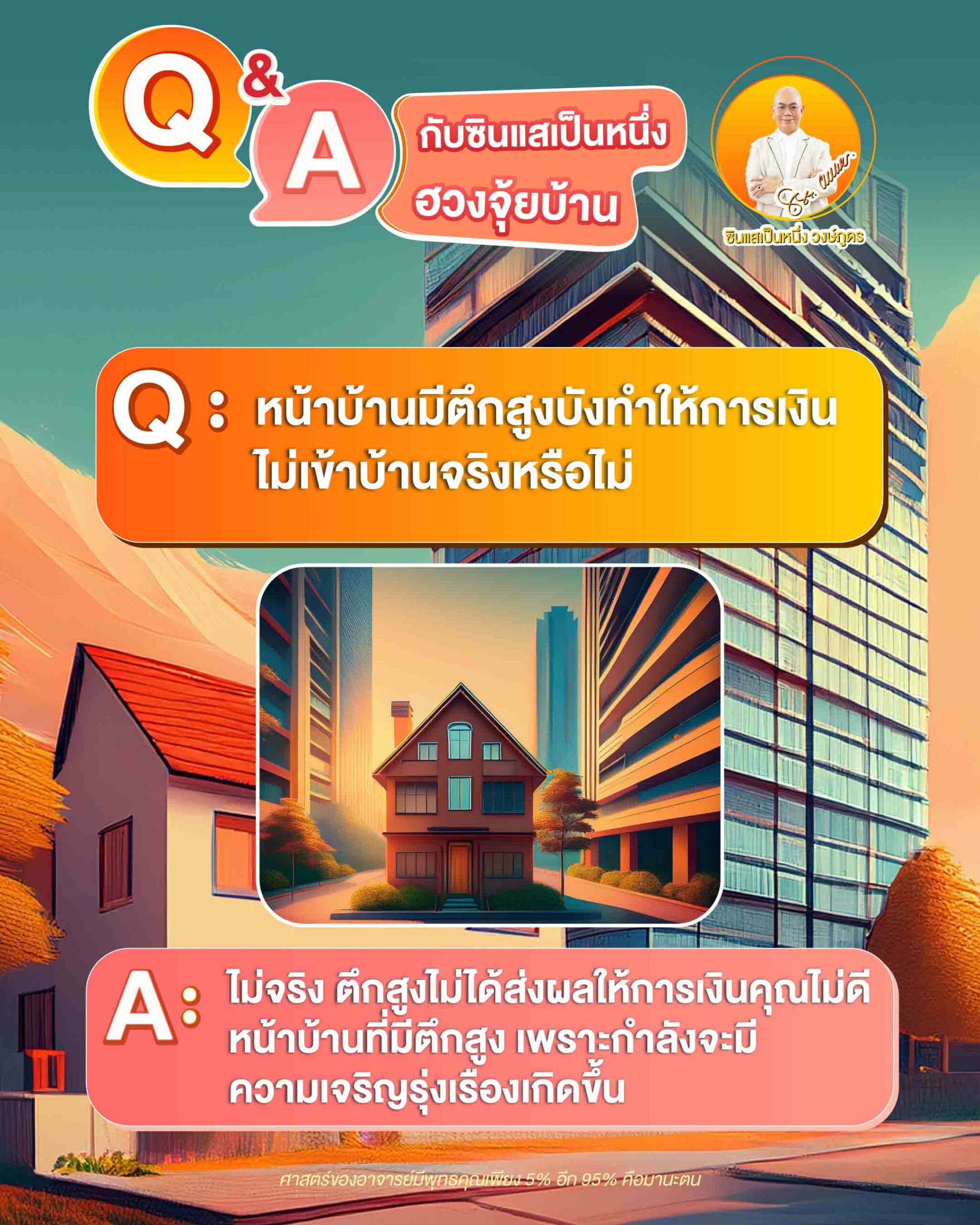 Q&A ฮวงจุ้ย ตึกสูงบังหน้าบ้านเงินไม่เข้า Q : หน้าบ้านมีตึกสูงบังทำให้การเงินไม่เข้าบ้านจริงหรือไม่ A : ไม่จริง ตึกสูงไม่ได้ส่งผลให้การเงินคุณไม่ดี หน้าบ้านที่มีตึกสูง เพราะกำลังจะความเจริญรุ่งเรืองเกิดขึ้น PrevNext