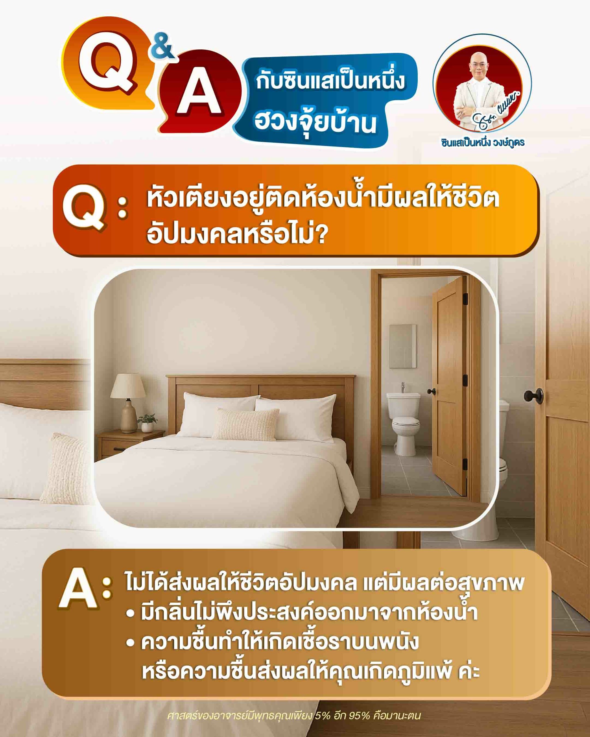 Q&A ฮวงจุ้ย หัวเตียงติดห้องน้ำอัปมงคลกับชีวิต Q : หัวเตียงอยู่ติดห้องน้ำมีผลให้ชีวิตอัปมงคลหรือไม่ A : ไม่ได้ส่งผลให้ชีวิตอัปมงคล แต่มีผลต่อสุขภาพ มีกลิ่นไม่พึงประสงค์ออกมาจากห้องน้ำ ความชื้นทำให้เกกดเชื้อราบนพนัง หรือ ความชื้นส่งผลให้คุณเกิดภูมิแพ้ ค่ะ PrevNext