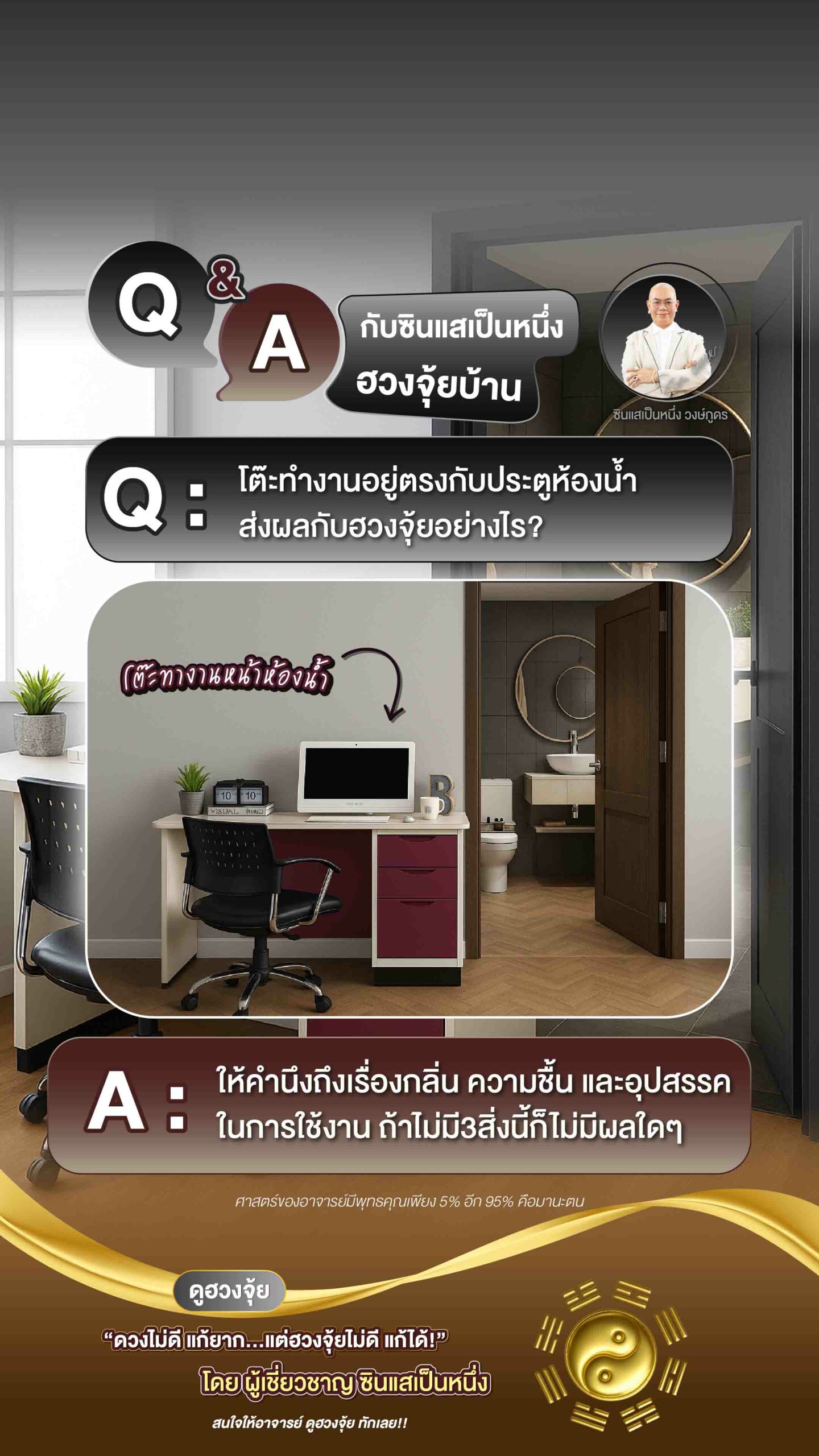 Q&A โต๊ะทํางานอยู่ตรงกับประตูห้องน้ํา Q : โต๊ะทํางานอยู่ตรงกับประตูห้องน้ํา ส่งผลกับฮวงจุ้ยอย่างไร A : ให้คํานึงถึงเรื่องกลิ่น ความชื้น และอุปสรรคในการใช้งาน ถ้าไม่มี3สิ่งนี้ก็ไม่มีผลใดๆค่ะ PrevNext